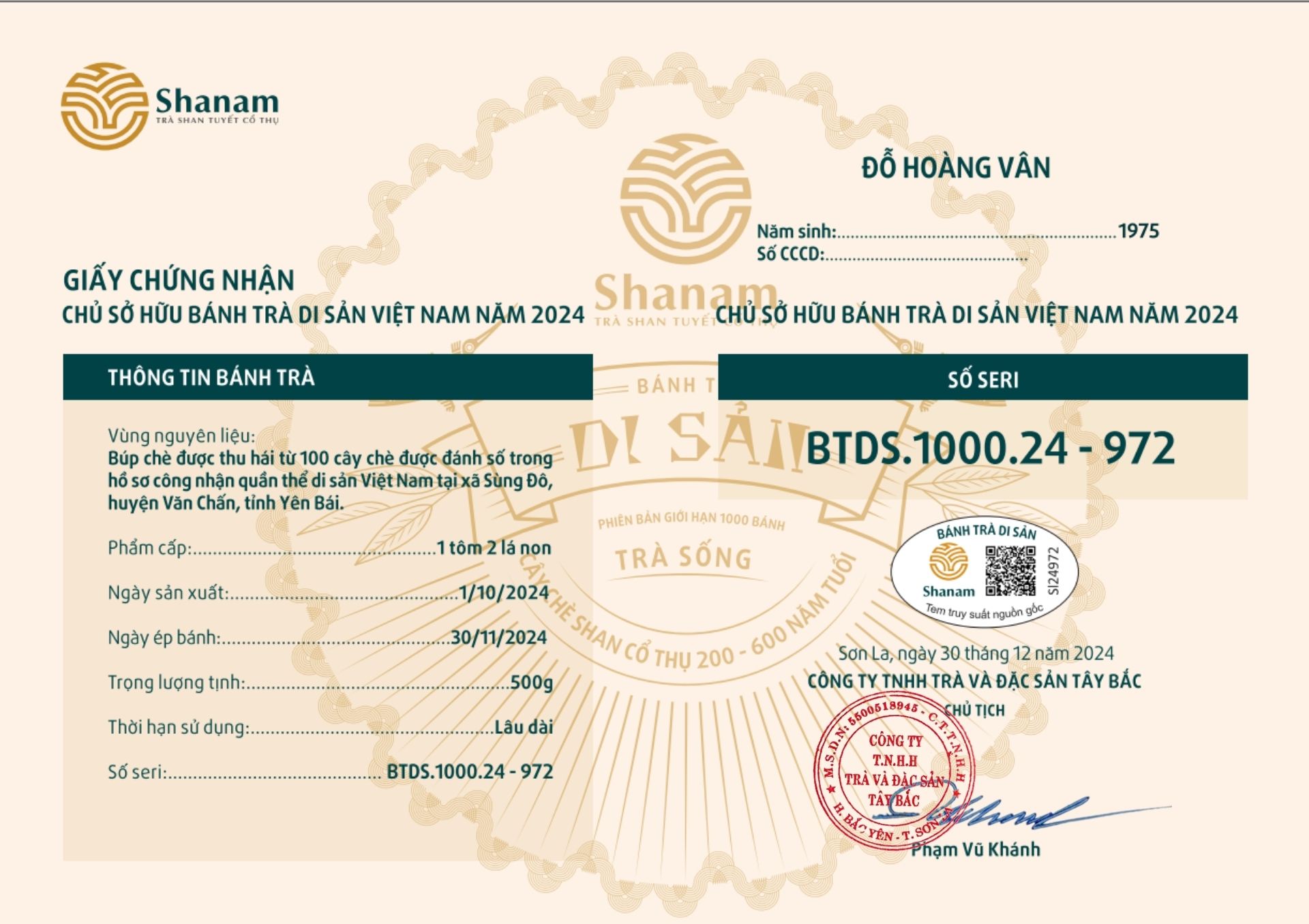 Bánh trà Di sản Việt Nam năm 2023 sản xuất số lượng giới hạn 500 bánh, được đánh mã số từng bánh trà theo thứ tự từ 1 – 500 và có chữ ký trực tiếp của người sáng lập thương hiệu trà Shanam Phạm Vũ Khánh trên từng bánh trà. Mỗi bánh trà có QR riêng truy suất về website www.shanam.com.vn chứng minh chủ sở hữu của bánh trà.