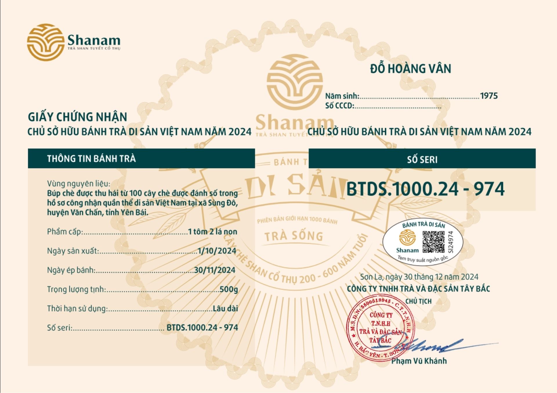 Bánh trà Di sản Việt Nam năm 2023 sản xuất số lượng giới hạn 500 bánh, được đánh mã số từng bánh trà theo thứ tự từ 1 – 500 và có chữ ký trực tiếp của người sáng lập thương hiệu trà Shanam Phạm Vũ Khánh trên từng bánh trà. Mỗi bánh trà có QR riêng truy suất về website www.shanam.com.vn chứng minh chủ sở hữu của bánh trà.