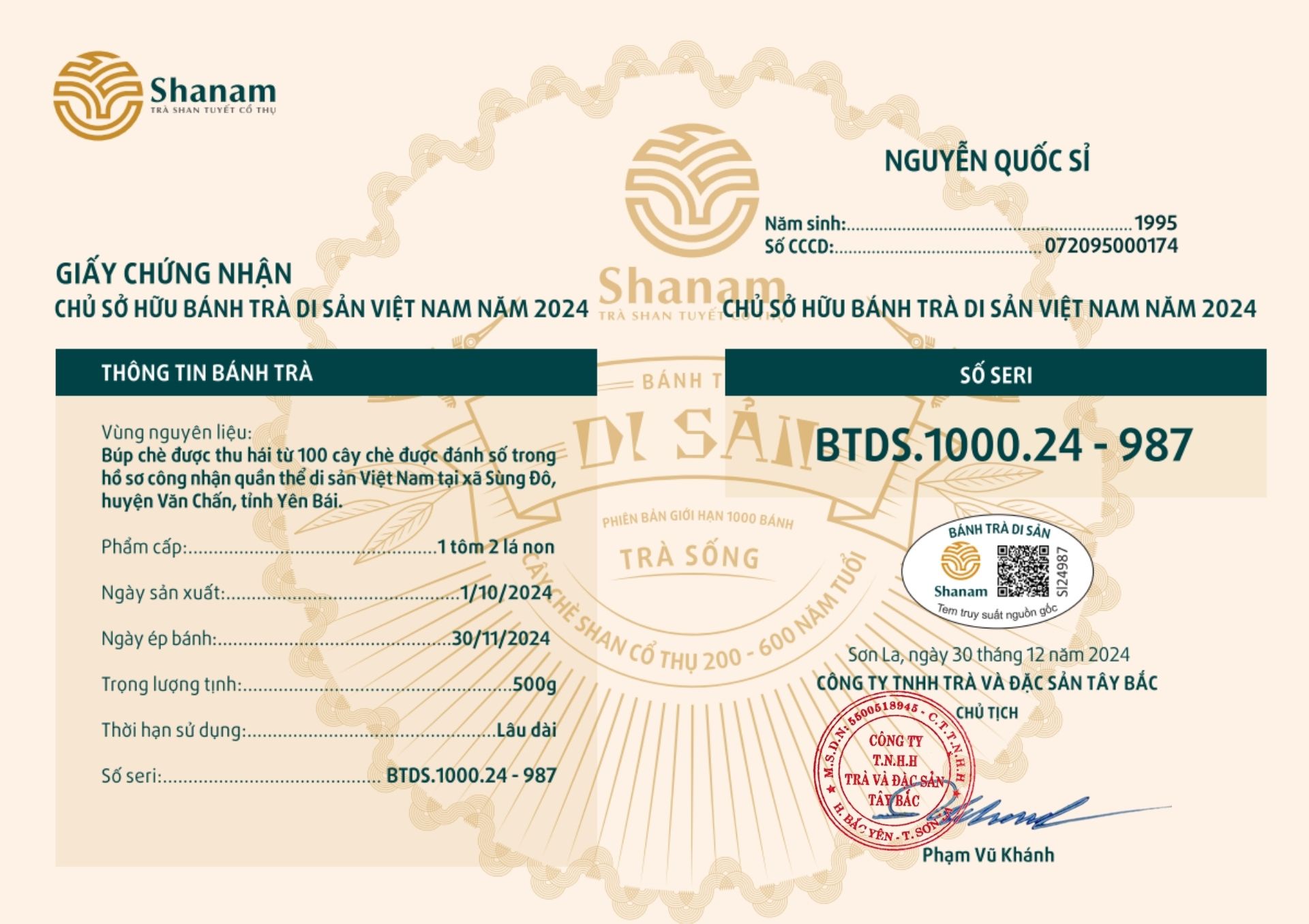 Bánh trà Di sản Việt Nam năm 2023 sản xuất số lượng giới hạn 500 bánh, được đánh mã số từng bánh trà theo thứ tự từ 1 – 500 và có chữ ký trực tiếp của người sáng lập thương hiệu trà Shanam Phạm Vũ Khánh trên từng bánh trà. Mỗi bánh trà có QR riêng truy suất về website www.shanam.com.vn chứng minh chủ sở hữu của bánh trà.