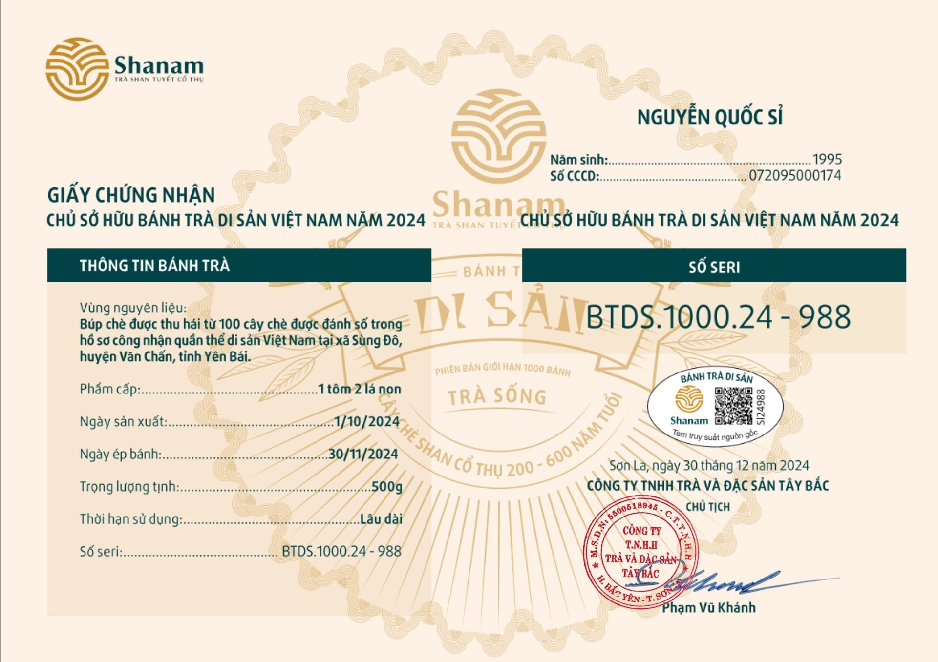 Bánh trà Di sản Việt Nam năm 2023 sản xuất số lượng giới hạn 500 bánh, được đánh mã số từng bánh trà theo thứ tự từ 1 – 500 và có chữ ký trực tiếp của người sáng lập thương hiệu trà Shanam Phạm Vũ Khánh trên từng bánh trà. Mỗi bánh trà có QR riêng truy suất về website www.shanam.com.vn chứng minh chủ sở hữu của bánh trà.