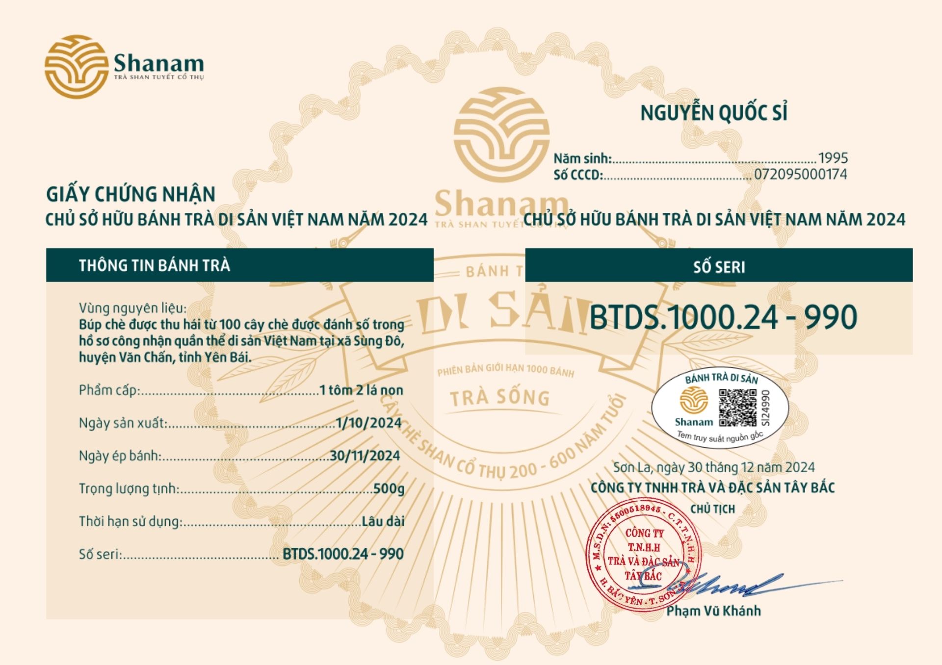 Bánh trà Di sản Việt Nam năm 2023 sản xuất số lượng giới hạn 500 bánh, được đánh mã số từng bánh trà theo thứ tự từ 1 – 500 và có chữ ký trực tiếp của người sáng lập thương hiệu trà Shanam Phạm Vũ Khánh trên từng bánh trà. Mỗi bánh trà có QR riêng truy suất về website www.shanam.com.vn chứng minh chủ sở hữu của bánh trà.