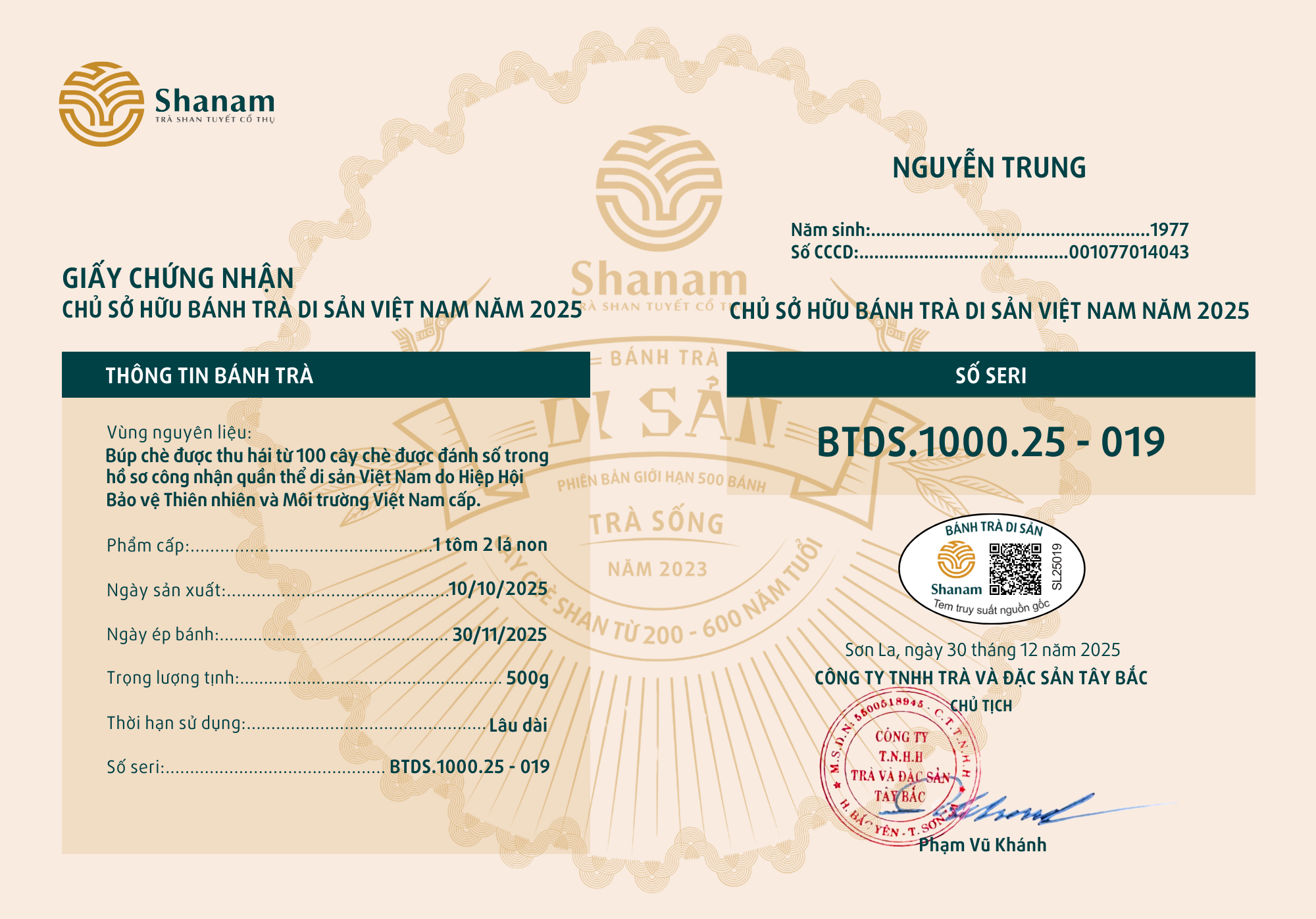 Bánh trà Di sản Việt Nam năm 2023 sản xuất số lượng giới hạn 500 bánh, được đánh mã số từng bánh trà theo thứ tự từ 1 – 500 và có chữ ký trực tiếp của người sáng lập thương hiệu trà Shanam Phạm Vũ Khánh trên từng bánh trà. Mỗi bánh trà có QR riêng truy suất về website www.shanam.com.vn chứng minh chủ sở hữu của bánh trà.