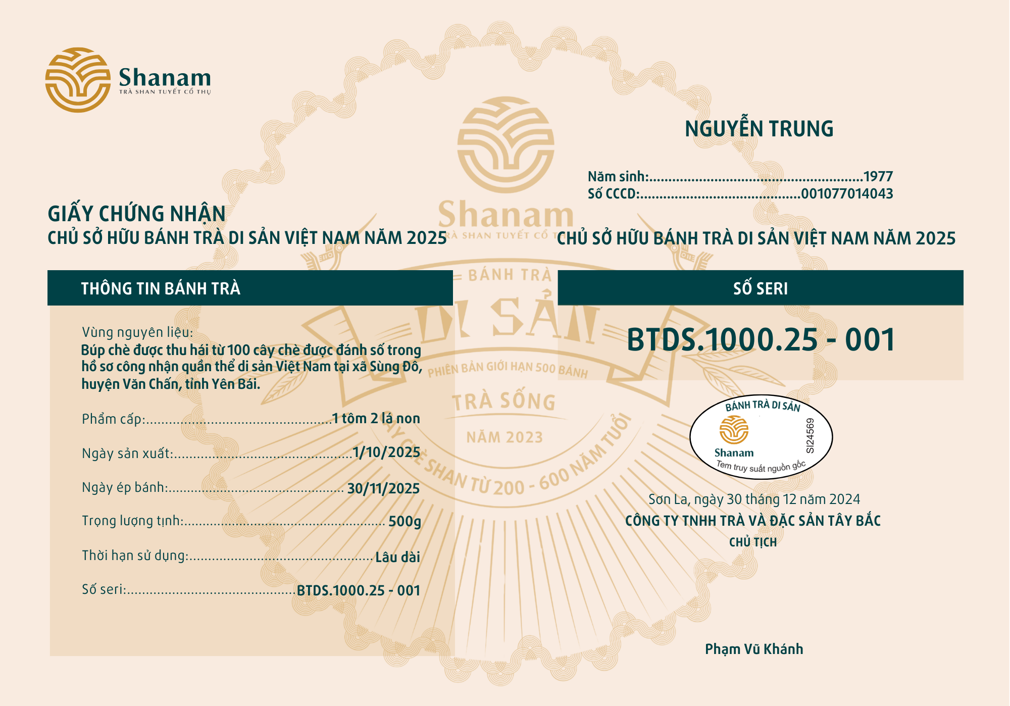 Bánh trà Di sản Việt Nam năm 2023 sản xuất số lượng giới hạn 500 bánh, được đánh mã số từng bánh trà theo thứ tự từ 1 – 500 và có chữ ký trực tiếp của người sáng lập thương hiệu trà Shanam Phạm Vũ Khánh trên từng bánh trà. Mỗi bánh trà có QR riêng truy suất về website www.shanam.com.vn chứng minh chủ sở hữu của bánh trà.