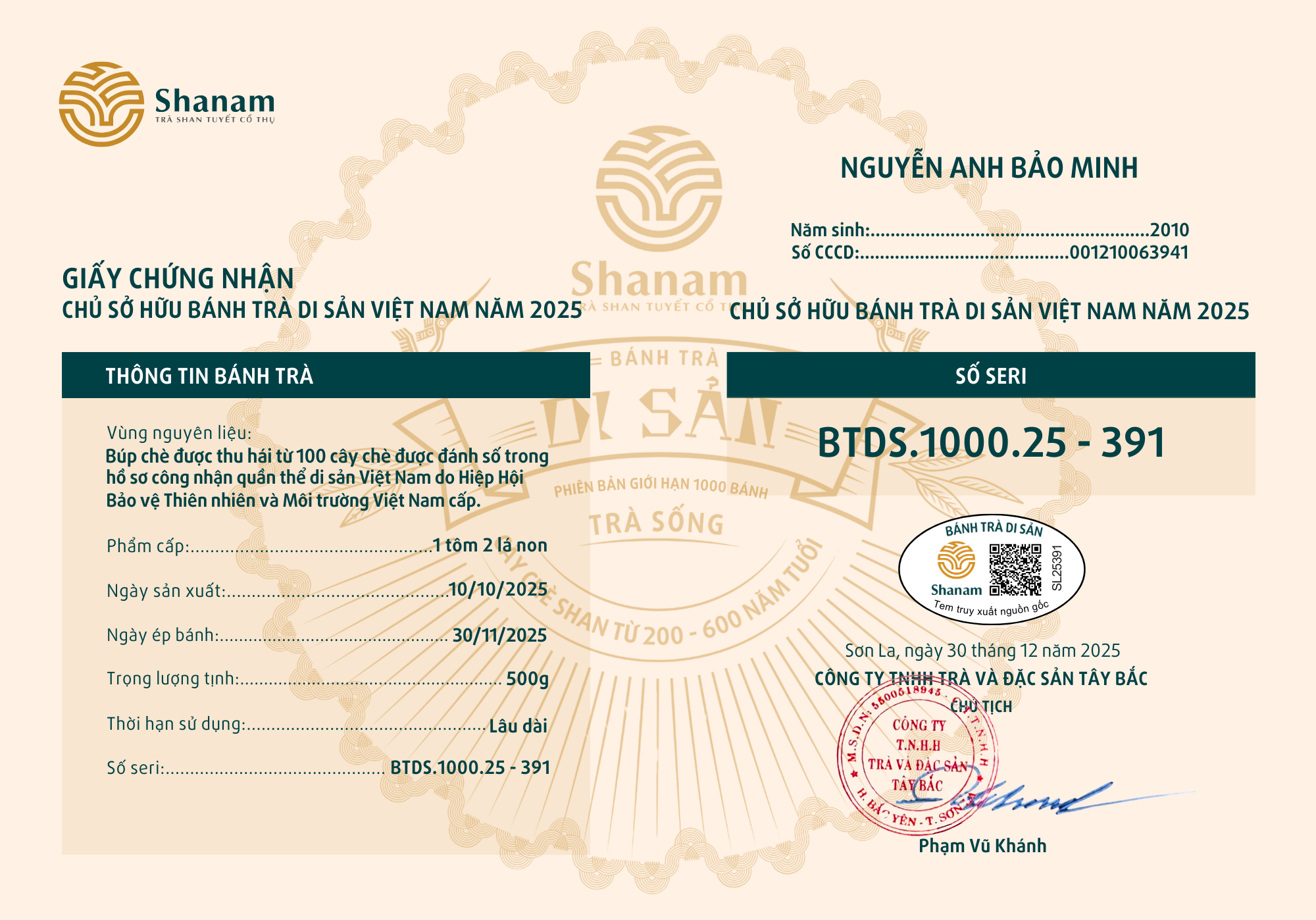 Bánh trà Di sản Việt Nam năm 2023 sản xuất số lượng giới hạn 500 bánh, được đánh mã số từng bánh trà theo thứ tự từ 1 – 500 và có chữ ký trực tiếp của người sáng lập thương hiệu trà Shanam Phạm Vũ Khánh trên từng bánh trà. Mỗi bánh trà có QR riêng truy suất về website www.shanam.com.vn chứng minh chủ sở hữu của bánh trà.