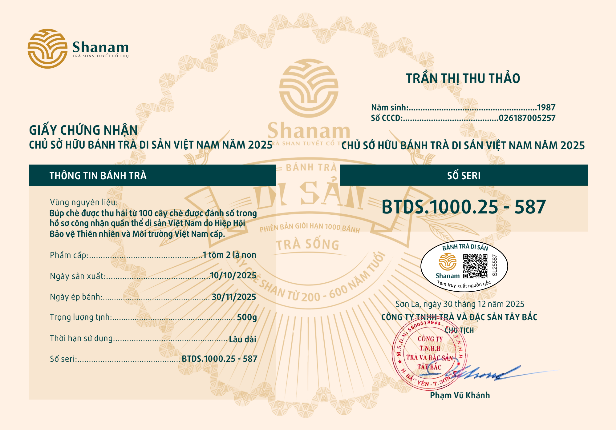 Bánh trà Di sản Việt Nam năm 2023 sản xuất số lượng giới hạn 500 bánh, được đánh mã số từng bánh trà theo thứ tự từ 1 – 500 và có chữ ký trực tiếp của người sáng lập thương hiệu trà Shanam Phạm Vũ Khánh trên từng bánh trà. Mỗi bánh trà có QR riêng truy suất về website www.shanam.com.vn chứng minh chủ sở hữu của bánh trà.