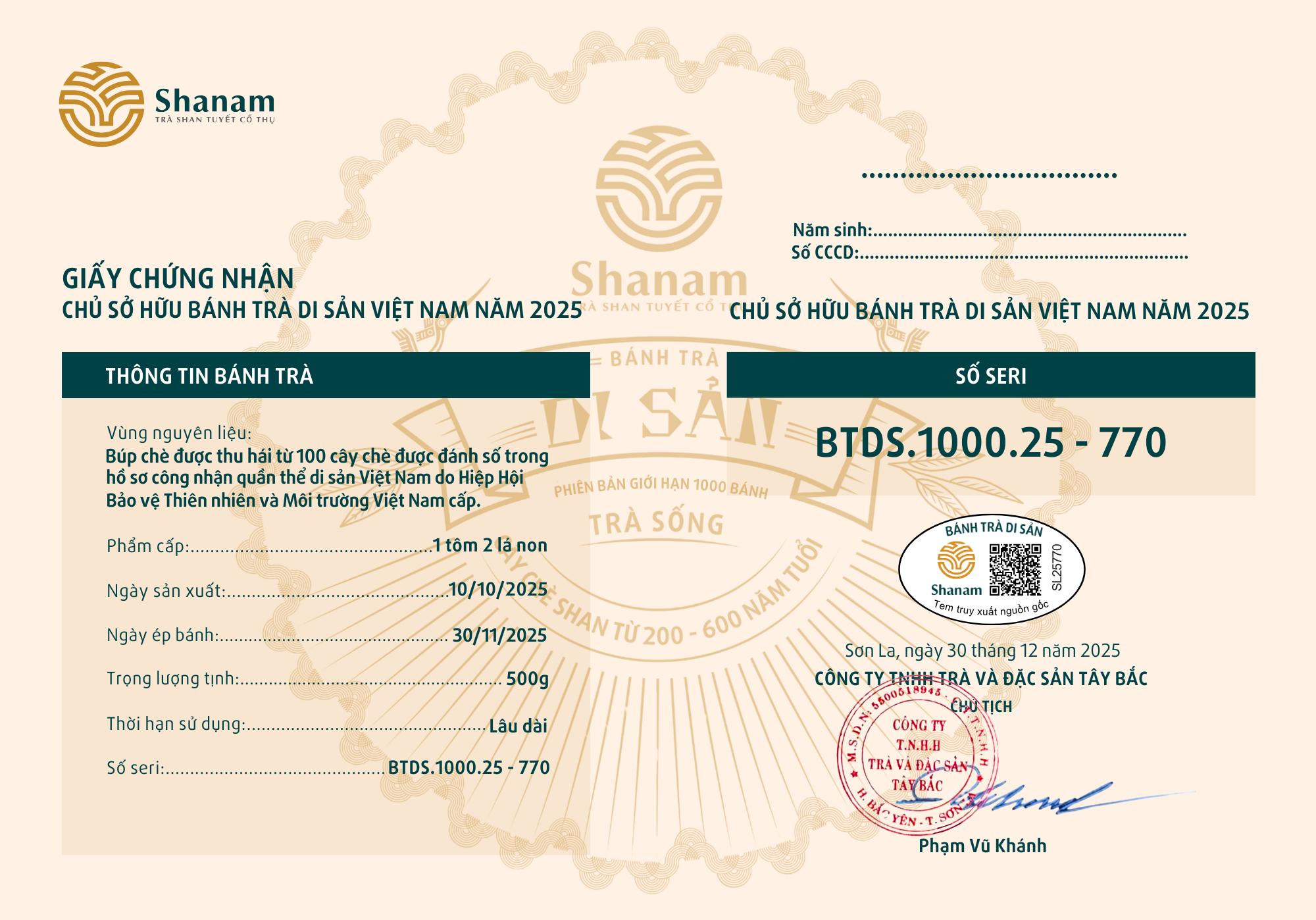 Bánh trà Di sản Việt Nam năm 2023 sản xuất số lượng giới hạn 500 bánh, được đánh mã số từng bánh trà theo thứ tự từ 1 – 500 và có chữ ký trực tiếp của người sáng lập thương hiệu trà Shanam Phạm Vũ Khánh trên từng bánh trà. Mỗi bánh trà có QR riêng truy suất về website www.shanam.com.vn chứng minh chủ sở hữu của bánh trà.