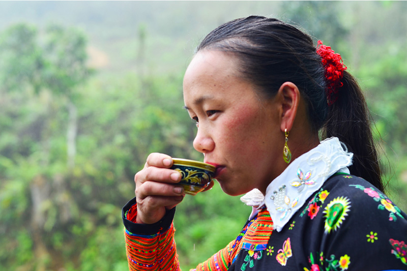 Cô gái H'Mông Tà Xùa uống trà buổi sớm