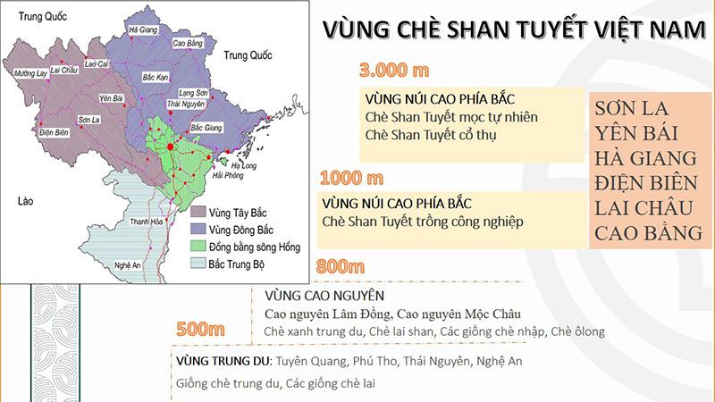 Việt Nam có 6 vùng nguyên liệu chè shan Tuyết gồm: Hà Giang, Lào Cai, Yên Bái, Sơn La, Điện Biên và Hòa Bình. Mỗi một vùng khác nhau sẽ cho ra chất lượng búp chè khác nhau chủ yếu là do điều kiện thổ nhưỡng, khí hậu, địa hình khác nhau.