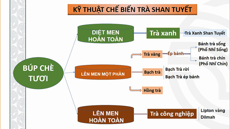 Có 2 kỹ thuật chế biến thường được dùng trong chế biến chè Shan Tuyết là kỹ thuật Diệt Men và kỹ thuật Lên Men.