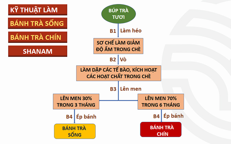Từ búp chè tươi B1: Sơ chế để giảm độ ẩm trong chè (Làm héo) * Quá trình lên men còn lại không nhiều, chất lượng trà chín cơ bản không thay đổi nhiều theo thời gian |